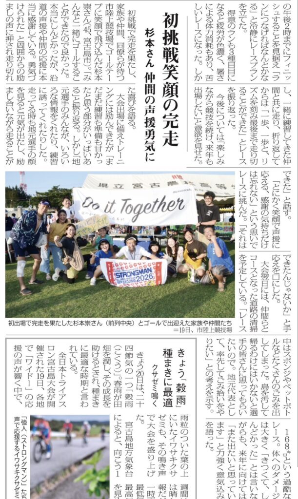 このたび、当社スタッフの杉本が「宮古島トライアスロン2026」に初出場し、見事完走いたしました!さらにその様子は新聞にも掲載され、地域の話題として取り上げていただきました。